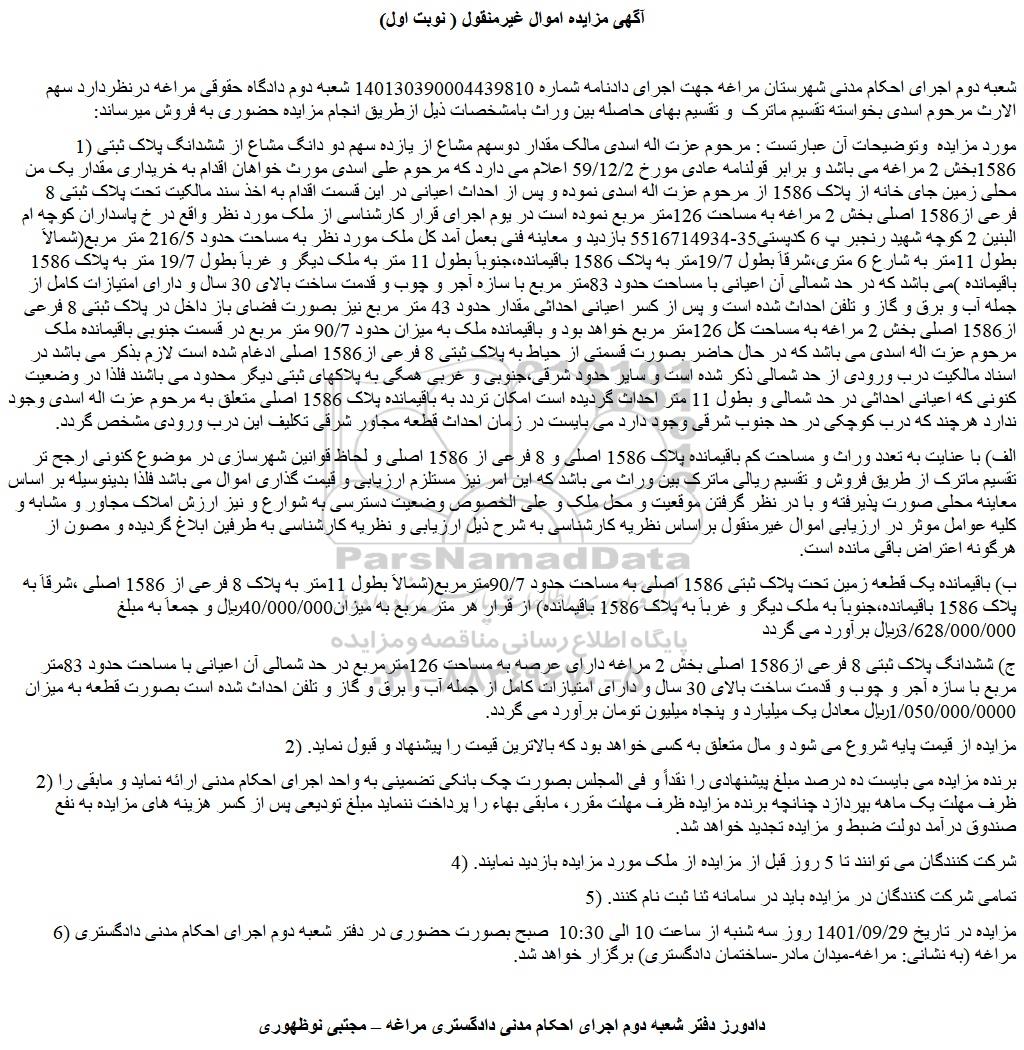 شعبه دوم اجرای احکام مدنی شهرستان مراغه جهت اجرای دادنامه شماره 140130390004439810 شعبه دوم دادگاه حقوقی مراغه درنظردارد سهم الارث مرحوم اسدی بخواسته تقسیم ماترک و تقسیم بهای حاصله بین وراث بامشخصات ذیل ازطریق انجام مزایده حضوری به فروش میرساند: