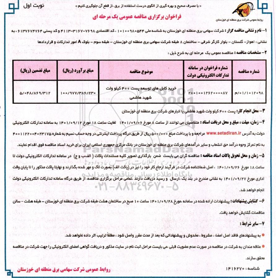 | 1012098/ 01 / م | 2001001262000087 | خرید کابل های توسعه پست 400 کیلوولت شهید هاشمی | 100.977.386.230 | 5.048.869.312 |