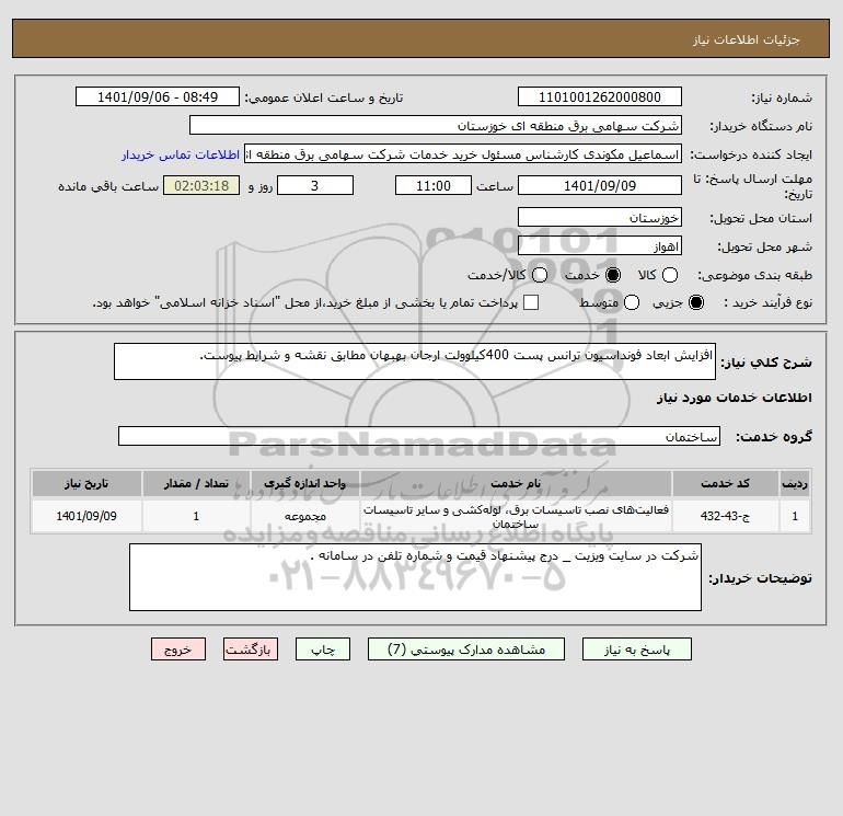 شرح کلی نیاز: افزایش ابعاد فونداسیون ترانس پست 400کیلوولت ارجان بهبهان مطابق نقشه و شرایط پیوست.