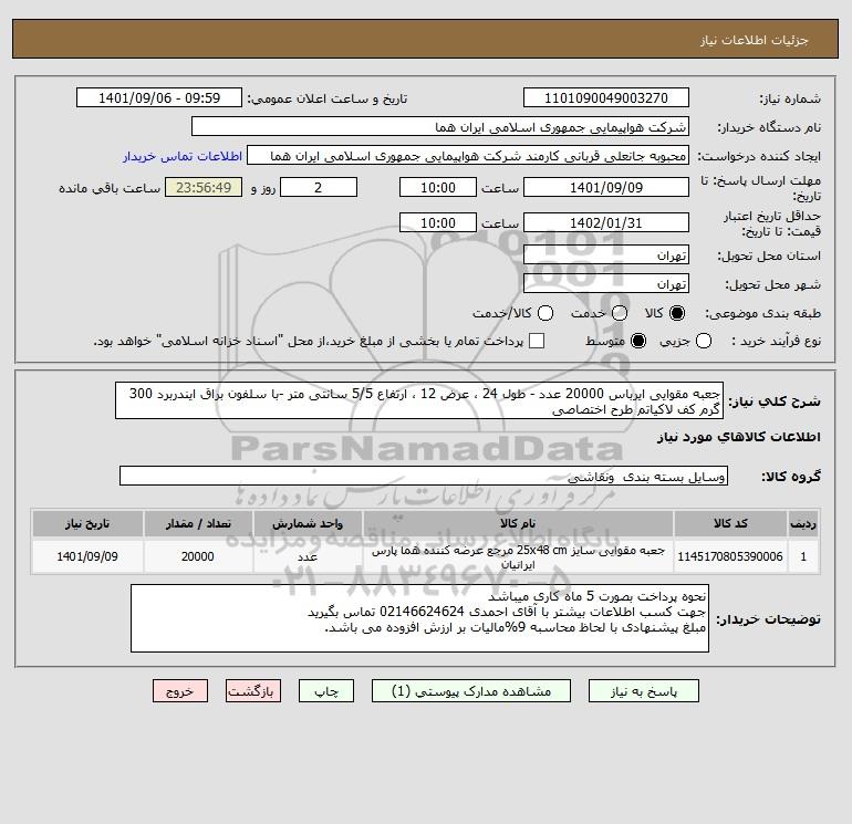 | 1 | 1145170805390006 | جعبه مقوایی سایز 25x48 cm مرجع عرضه کننده هما پارس ایرانیان | عدد | 20000 | 1401/09/09 |