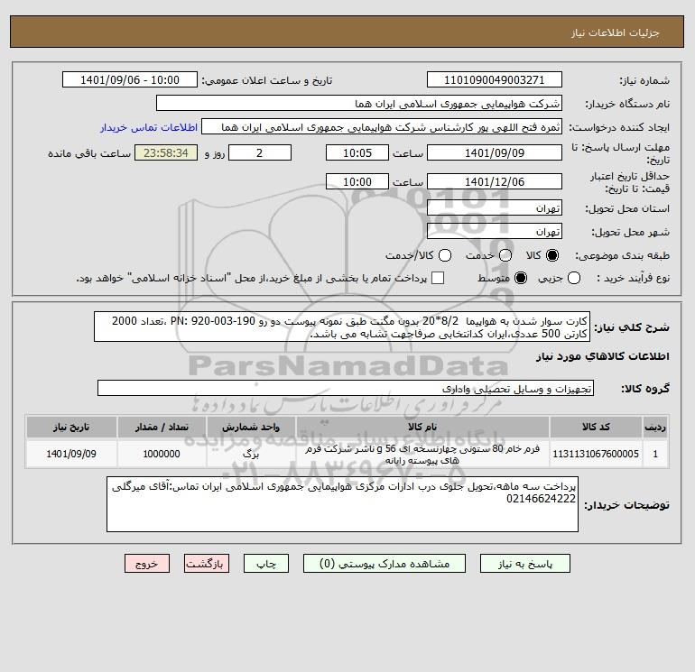 شرح کلی نیاز: کارت سوار شدن به هواپیما 8/2*20 بدون مگنت طبق نمونه پیوست دو رو PN: 920-003-190 ،تعداد 2000 کارتن 500 عددی،ایران کدانتخابی صرفاجهت تشابه می باشد.