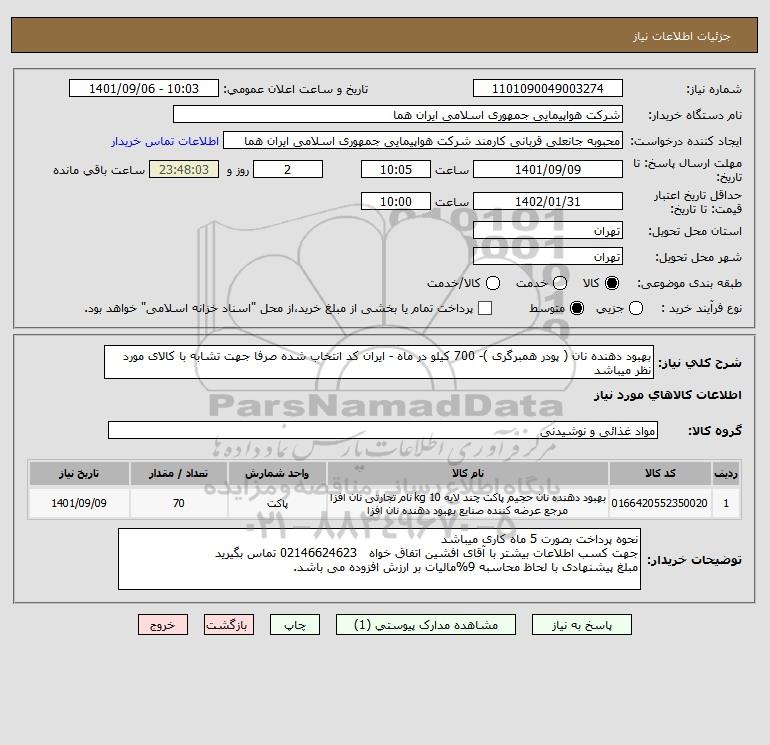 شرح کلی نیاز: بهبود دهنده نان ( پودر همبرگری )- 700 کیلو در ماه - ایران کد انتخاب شده صرفا جهت تشابه با کالای مورد نظر میباشد