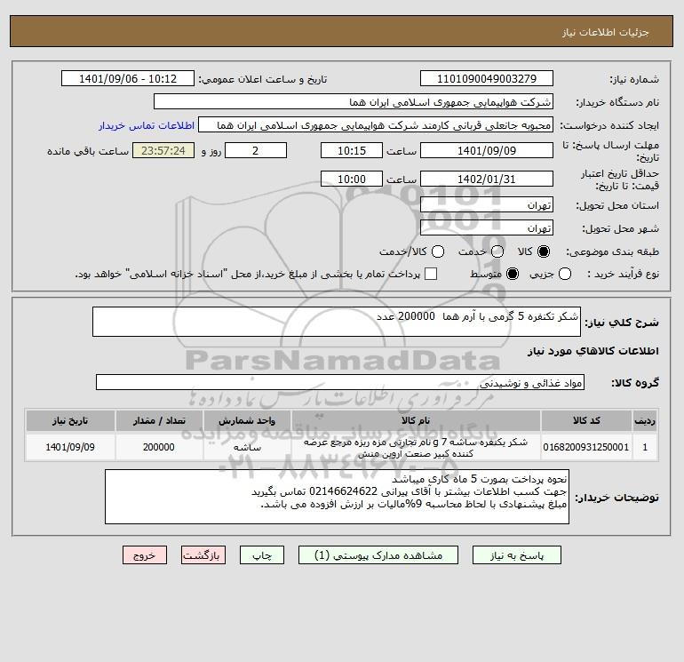 شرح کلی نیاز: شکر تکنفره 5 گرمی با آرم هما 200000 عدد
