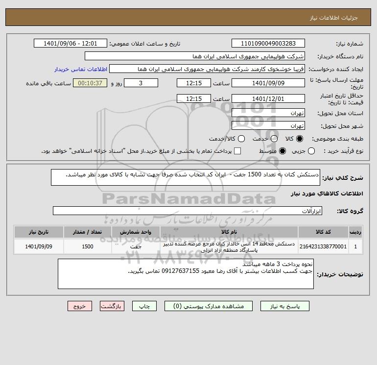 شرح کلی نیاز: دستکش کتان به تعداد 1500 جفت - ایران کد انتخاب شده صرفا جهت تشابه با کالای مورد نظر میباشد.