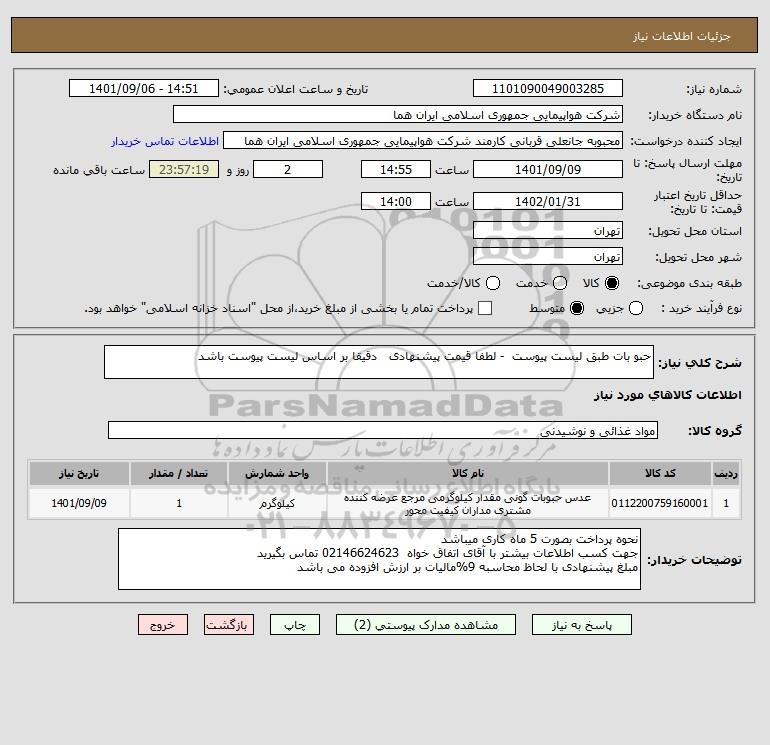شرح کلی نیاز: حبو بات طبق لیست پیوست - لطفا قیمت پیشنهادی دقیقا بر اساس لیست پیوست باشد