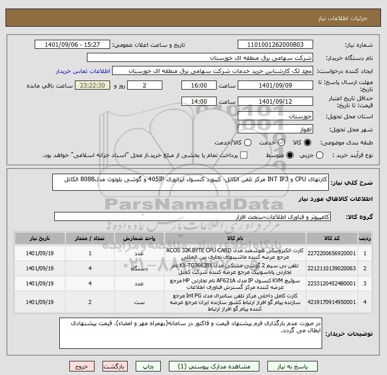 شرح کلی نیاز: کارتهای CPU و INT IP3 مرکز تلفن الکاتل- کیبورد کنسول اپراتوری 405IP و گوشی بلوتوث مدل8088 الکاتل