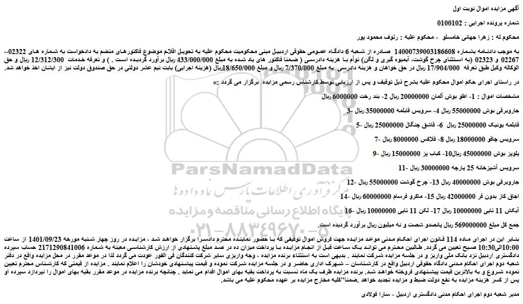 ،به موجب دادنامه بشماره 14000739003186608 صادره از شعبه 6 دادگاه عمومی حقوقی اردبیل مبنی محکومیت محکوم علیه به تحویل اقلام موضوع فاکتورهای منضم به دادخواست به شماره های 02322، 02267 و 02323 (به استثنای چرخ گوشت، آبمیوه گیری و لگن) توأم با هزینه دادرسی ( ضمنا فاکتور های یاد شده به مبلغ 433/000/000 ریال برآورد گردیده است . ) و تعرفه خدمات 12/312/300 ریال و حق الوکاله وکیل طبق تعرفه 17/904/000 ریال در حق خواهان و هزینه دادرسی به مبلغ 7/370/000 ریال و مبلغ 18/650/000ریال (هزینه اجرایی) بابت نیم عشر دولتی در حق صندوق دولت نیز از ایشان اخذ خواهد شد.
