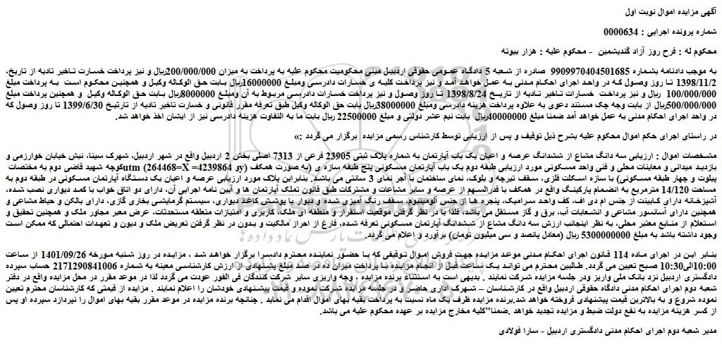 بنابر این در اجرای ماده 114 قانون اجرای احکام مدنی موعد مزایده جهت فروش اموال توقیفی که با حضور نماینده محترم دادسرا برگزار خواهد شد ، مزایده در روز شنبه مورخه 1401/09/26 از ساعت 10:00الی10:30 صبح تعیین می گردد. طالبین محترم می تواند یک ساعت قبل از انجام مزایده با پرداخت میزان ده در صد مبلغ پشنهادی از ارزش کارشناسی معینه به شماره 2171290841006 حساب سپرده دادگستری اردبیل نزد بانک ملی واریز ودر جلسه مزایده شرکت نمایند . بدیهی است به استثناء برنده مزایده ، وجه واریزی سایر شرکت کنندگان فی الفور عودت می گردد لذا در موعد مقرر در محل مزایده واقع در دفتر شعبه دوم اجرای احکام مدنی دادگاه حقوقی اردبیل واقع در کارشناسان – شهرک اداری حاضر و در جلسه مزایده شرکت نموده و قیمت پیشنهادی خودشان را اعلام نمایند . مزایده از قیمتی که کارشناسان محترم تعیین نموده شروع و به بالاترین قیمت پیشنهادی فروخته خواهد شد.برنده مزایده ظرف یک ماه نسبت به پرداخت بقیه بهای اموال اقدام می نماید . چنانچه برنده مزایده در موعد مقرر بقیه بهای اموال را نپردازد سپرده او پس از کسر هزینه مزایده به نفع دولت ضبط و مزایده تجدید خواهد .ضمنا"کلیه مخارج مزایده بر عهده محکوم علیه می باشد
