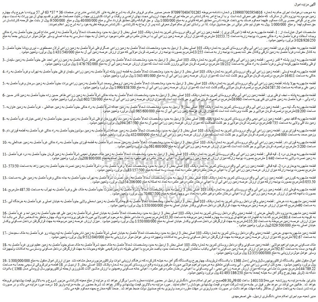 به موجب درخواست اجرای حکم به شماره 1399007005954616 و شماره دادنامه مربوطه 9709970404701265 ضمن صدور حکم بر فروش ماترک به شرح نظریه های کارشناسی مندرج در صفحات 36 * 37* 63 الی 57 پرونده با خروج یک چهارم زمین موسوم به دوزوم داش از ماترک که متعلق غیر معرفی شده است و با ارجاع امر به کارشناس در مرحله اجرای حکم جهت ارزیابی مجدد بهای اراضی و رقبات و ادوات کشاورزی جهت رعایت مصلحت طرفین و تقسیم بهای آن بین وراث به نسبت سهام مندرج در گواهی حصر وراثت محکوم علیهما محکوم هستند به پرداخت هزینه دادرسی مطابق تعرفه قانونی و به مبلغ 1/000/000 ریال و حق الوکاله وکیل مطابق قرارداد مالی و مبلغ 40/000/000 ریال و مبلغ 9/500/000 ریال از بابت حق الزحمه کارشناسان در حق محکوم لهما و مبلغ 1/000/000 ریال به عنوان نیم عشر دولتی در حق صندوق دولت .لذا در راستای اجرای حکم اموال معرفی شده پس از ارجاع به کارشناسی ، کارشناس مربوطه نظریه خود را به شرح زیر اعلام نمودند: