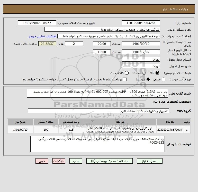 شرح کلی نیاز: تونر پرینتر (13A) لیزری HP – 1300،به شماره PN:421-002-007 به تعداد 100 عدد،ایران کد انتخاب شده صرفا جهت تشابه می باشد.