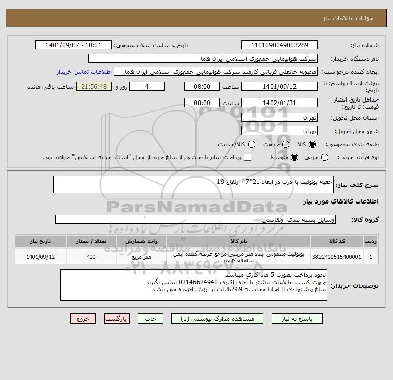 شرح کلی نیاز: جعبه یونولیت با درب در ابعاد 21*47 ارتفاع 19