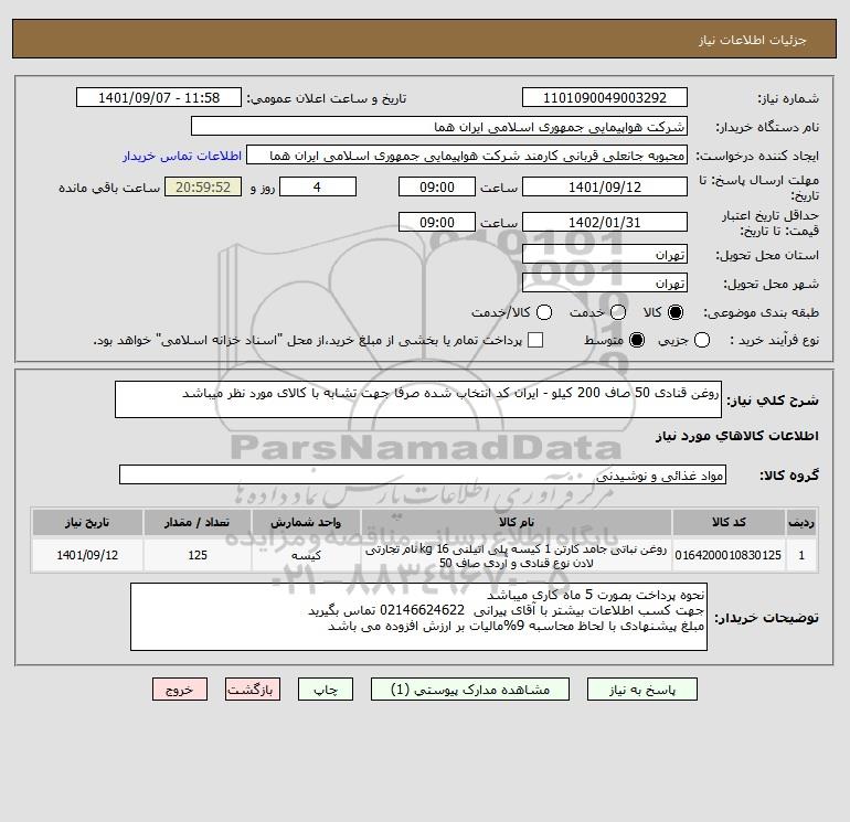 شرح کلی نیاز: روغن قنادی 50 صاف 200 کیلو - ایران کد انتخاب شده صرفا جهت تشابه با کالای مورد نظر میباشد