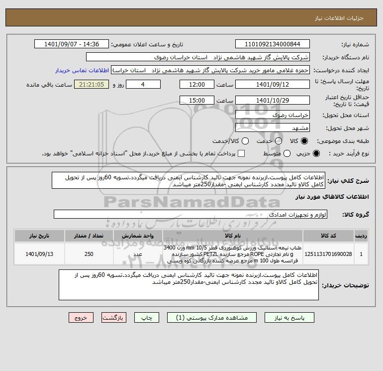 نام دستگاه خریدار:شرکت پالایش گاز شهید هاشمی نژاد استان خراسان رضوی