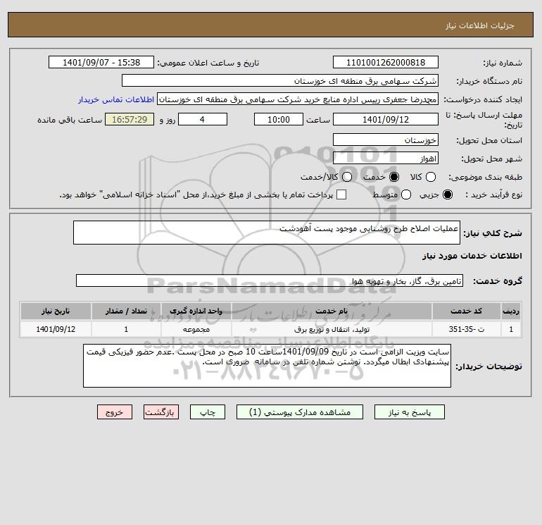 شرح کلی نیاز: عملیات اصلاح طرح روشنایی موجود پست آهودشت