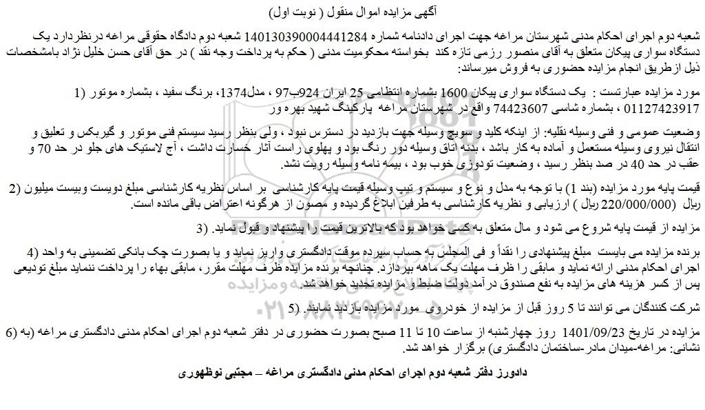 1) مورد مزایده عبارتست : یک دستگاه سواری پیکان 1600 بشماره انتظامی 25 ایران 924ب97 ، مدل1374، برنگ سفید ، بشماره موتور 01127423917 ، بشماره شاسی 74423607 واقع در شهرستان مراغه پارکینگ شهید بهره ور
