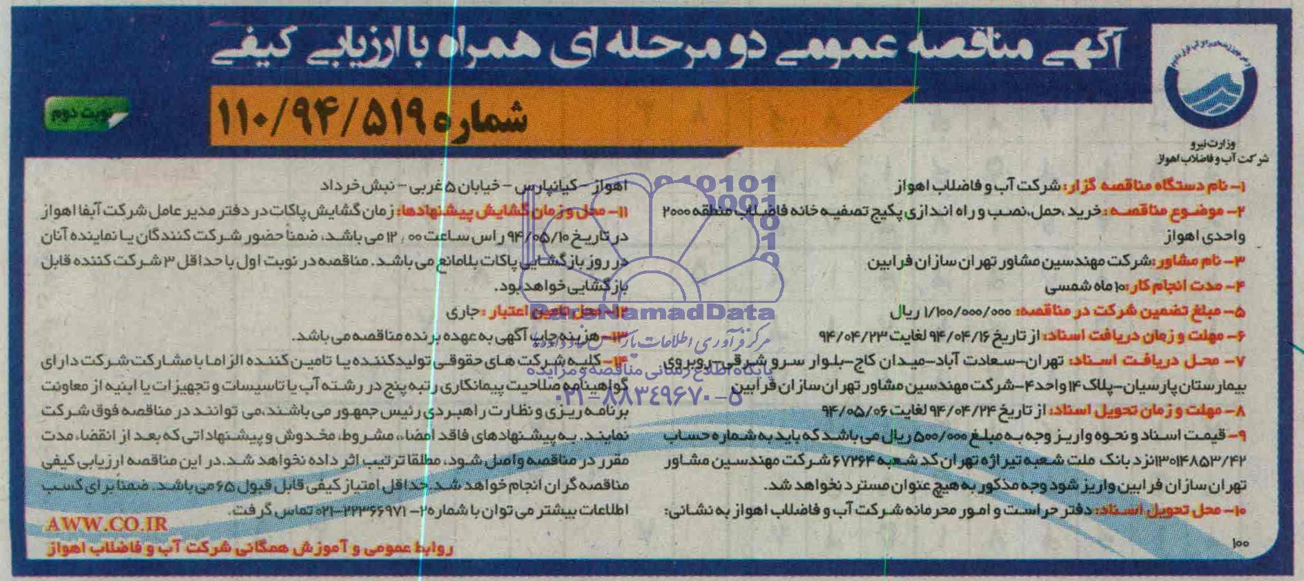 نام دستگاه مناقصه گزار: شرکت آب و فاضلاب اهواز