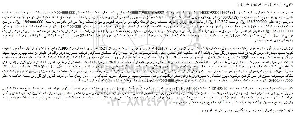 بنابراین جلسه مزایده به روز چهارشنبه مورخه 1401/09/16 ساعت 12:00الی12:30صبح در اجرای احکام مدنی دادگستری اردبیل در حضور نماینده محترم دادسرا برگزار خواهد شد و مزایده از مبلغ معینه کارشناسی مزبور شروع و به بالاترین قیمت پیشنهادی فروخته خواهد شد . طالبین می توانند در موعد مقرر فوق در جلسه مزایده شرکت نموده و قیمت پیشنهادی خودشان را اعلام نمایند . مورد مزایده به بالاترین قیمت پیشنهادی واگذار خواهد شد شرط حضور در جلسه مزایده واریز 10 درصد مورد مزایده می باشد و در صورت برنده شدن نسبت به پرداخت مابقی آن حداکثر یکماه مهلت خواهد داشت در صورت عدم واریزی در مهلت مقرره درصد واریزی به نفع صندوق دولت ضبط خواهد شد . ضمناً کلیه مخارج بعهده محکوم علیه می باشد.