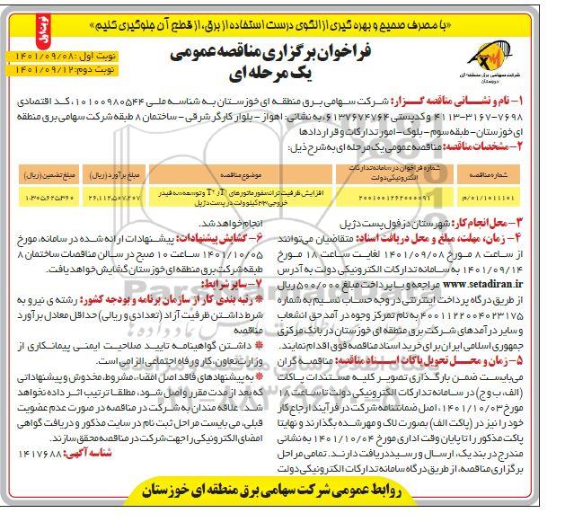 6- گشایش پیشنهادات پیشنهاد ات ارائه شده در سامانه مورخ 1401.10.5 ساعت 10 صبح در سالن مناقصات ساختمان 8 طبقه شرکت برق منطقه ای خوزستان گشایش خواهد یافت.