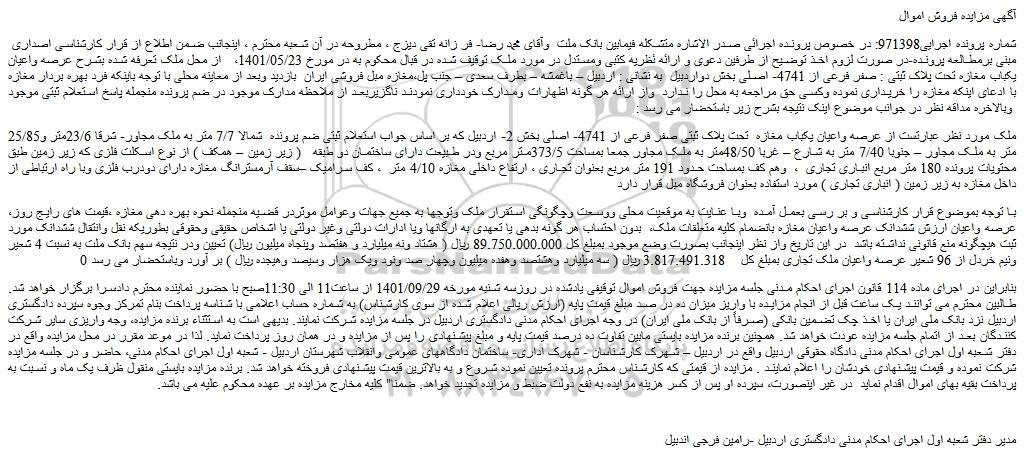 شماره پرونده اجرایی971398: در خصوص پرونده اجرائی صدر الاشاره متشکله فیمابین بانک ملت  وآقای محمد رضا- فر زانه تقی دیزج ، مطروحه در آن شعبه محترم ، اینجانب ضمن اطلاع از قرار کارشناسی اصداری  مبنی برمطالعه پرونده-در صورت لزوم اخذ توضیح از طرفین دعوی و ارائه ئظریه کتبی ومستدل در مورد ملک توقیف شده در قبال محکوم به در مورخ 1401/05/23،   از محل ملک تعرفه شده بشرح عرصه واعیان یکباب مغازه تحت پلاک ثبتی : صفر فرعی از 4741- اصلی بخش دواردبیل  به نشانی : اردبیل – باغمشه – بطرف سعدی – جنب پل،مغازه مبل فروشی ایران  بازدید وبعد از معاینه محلی با توجه باینکه فرد بهره بردار مغازه با ادعای اینکه مغازه را خریداری نموده وکسی حق مراجعه به محل را ندارد  واز ارائه هر گونه اظهارات ومدارک خودداری نمودند ناگزیربعد از ملاحظه مدارک موجود در ضم پرونده منجمله پاسخ استعلام ثبتی موجود  وبالاخره مداقه نظر در جوانب موضوع اینک نتیجه بشرح زیر باستحضار می رسد :