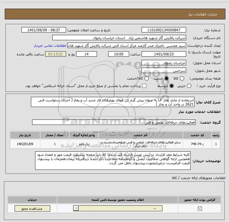 نام دستگاه خریدار:شرکت پالایش گاز شهید هاشمی نژاد استان خراسان رضوی