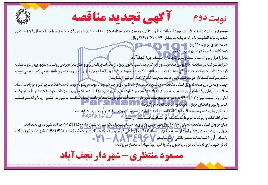 موضوع و برآورد اولیه مناقصه: پروژه آسفالت معابر سطح شهر شهرداری منطقه چهار نجف آباد بر اساس فهرست بها راه و باند سال 94 بدون تعدیل و مابه التفاوت با برآورد اولیه به مبلغ 2.422.770.542 ریال