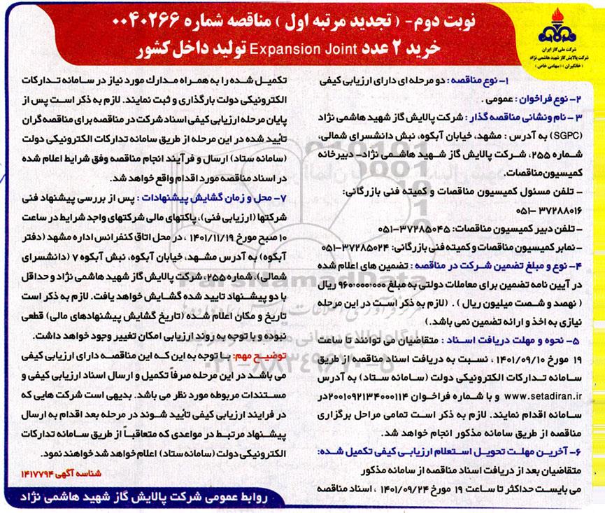 تجدید مرتبه اول مناقصه خرید 2 عدد Expansion Joint - نوبت دوم از کلیه افراد متخصص و شرکتها واجد شرایط دعوت به عمل میآید در مناقصه با کد خبرگزاری پارس نماد: 5216586 شرکت نمایند.