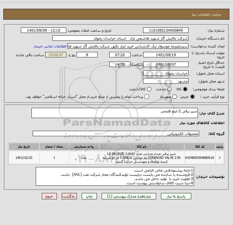 نام دستگاه خریدار:شرکت پالایش گاز شهید هاشمی نژاد استان خراسان رضوی