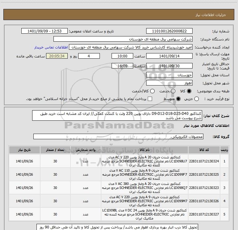 شرح کلی نیاز: کنتاکتور D9-D12-D18-D25-D40 دارای بوبین 220 ولت با کنتکت کمکی// ایران کد مشابه است خرید طبق شرح پیوست می باشد