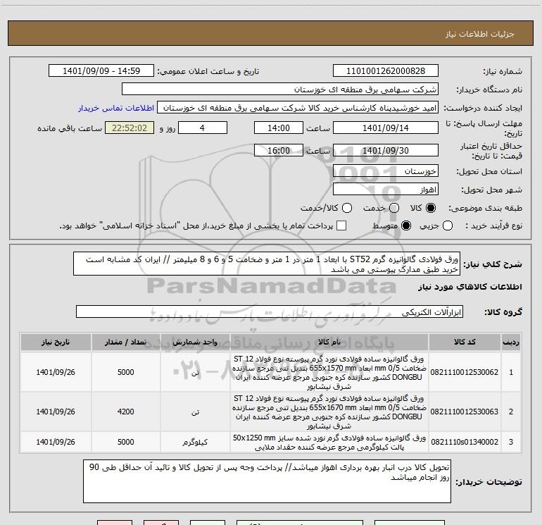 شرح کلی نیاز: ورق فولادی گالوانیزه گرم ST52 با ابعاد 1 متر در 1 متر و ضخامت 5 و 6 و 8 میلیمتر // ایران کد مشابه است خرید طبق مدارک پیوستی می باشد