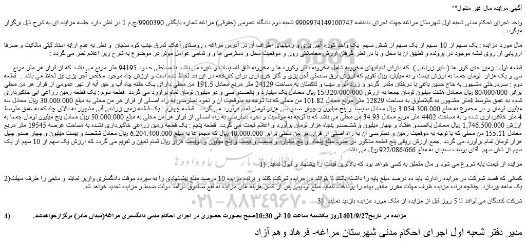 4) مزایده در تاریخ1401/9/27روز یکشنبه ساعت 10 الی 10:30صبح بصورت حضوری در اجرای احکام مدنی دادگستری مراغه(میدان مادر) برگزارخواهدشد.