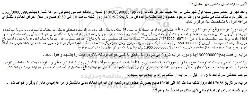 - مزایده در تاریخ 1401/9/26روز شنبه ساعت 10 الی 10:30صبح بصورت حضوری درشعبه اول اجرای احکام مدنی دادگستری مراغه(میدان مادر ) برگزار خواهد شد.