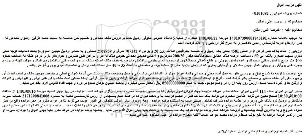 ، به موجب دادنامه شماره 140107390001843191 مورخه 1401/06/22 صادره از شعبه 5 دادگاه عمومی حقوقی اردبیل حکم بر فروش ملک مشاعی و تقسیم ثمن حاصله به نسبت حصه طرفین ازاموال مشاعی که پس ازارجاع امربه کارشناس رسمی دادگستری به شرح ذیل ارزیابی و واعلام گردیده است. ارزیابی : ملک پلاک ثبتی فرعی 9 از اصلی 4581 بخش یک اردبیل و با شناسه جغرافیایی املاک زون 26 و یو تی ام 707142 شرقی و 2568939 شمالی و به نشانی اردبیل خیابان امام (ره) پشت دخانیات کوچه شش متری شهید اصغری پلاک ابی 69 ، مساحت عرصه ملک مطابق سند مالکیت مقدار 200/20 مترمربع و اعیانی قدیمی احداثی جنوبی ملک با آجر و تیرآهن طاق ضربی و دیوارهای باربر در دو طبقه به مساحت حدود 200 متر مربع با نمای داخلی سفیدکاری شده ونمای بیرونی در ضلع شمالی سیمانکاری فرسوده و نمای جنوبی ساختمان مشرف به حیات ملک شسته سنگ ریزه و کف داخلی ساختمان موزائیک و موکت کهنه و درب و پنجره های پروفیلی و دربهای داخلی چوبی سه لای و گرمایش بخاری که در زمان بازدید خالی از سکنه بوده و ساختمان با قدمت 35 تا 40 سال احداث شده و دارای انشعابات آب و برق و گاز می باشد .