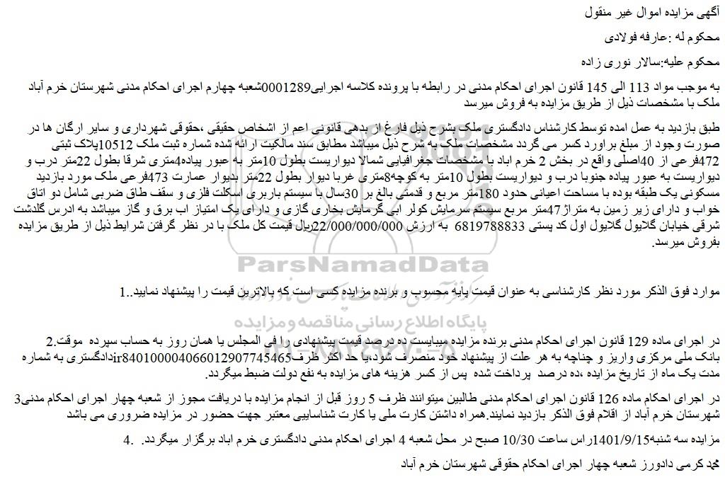 به موجب مواد 113 الی 145 قانون اجرای احکام مدنی در رابطه با پرونده کلاسه اجرایی0001289شعبه چهارم اجرای احکام مدنی شهرستان خرم آباد ملک با مشخصات ذیل از طریق مزایده به فروش میرسد