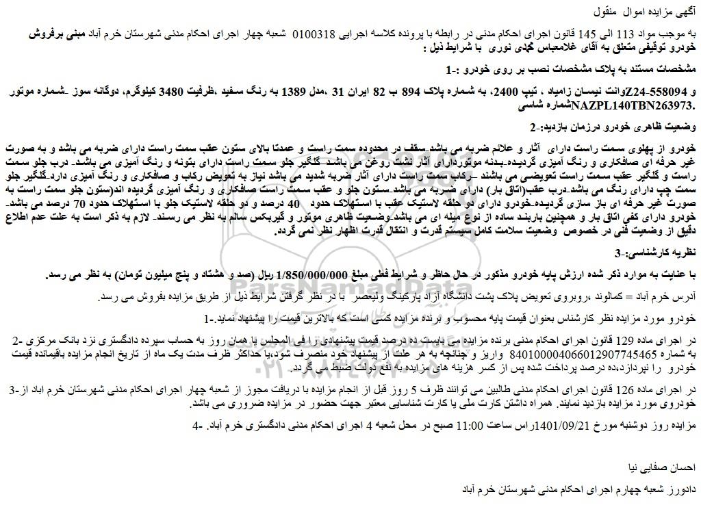 به موجب مواد 113 الی 145 قانون اجرای احکام مدنی در رابطه با پرونده کلاسه اجرایی 0100318  شعبه چهار اجرای احکام مدنی شهرستان خرم آباد مبنی برفروش  خودرو توقیفی متعلق به آقای غلامعباس محمدی نوری  با شرایط ذیل :