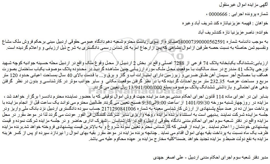 به موجب دادنامه شماره 140007390000562591صادره از سوی ریاست محترم شعبه دهم دادگاه عمومی حقوقی اردبیل مبنی برحکم فروش ملک مشاع وتقسیم ثمن حاصله به نسبت حصه طرفین ازاموال مشاعی که پس ازارجاع امربه کارشناس رسمی دادگستری به شرح ذیل ارزیابی و واعلام گردیده است.