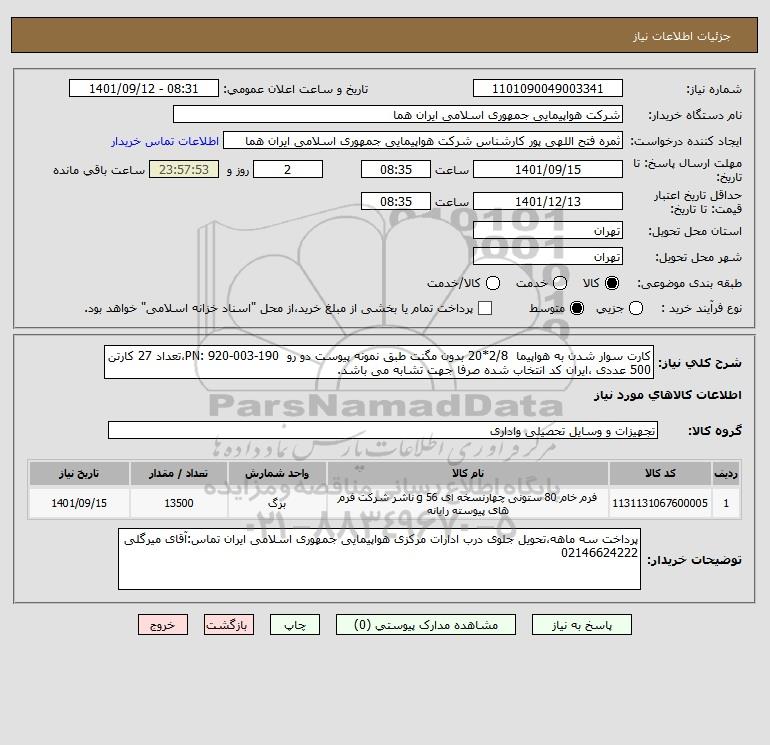 شرح کلی نیاز: کارت سوار شدن به هواپیما 2/8*20 بدون مگنت طبق نمونه پیوست دو رو PN: 920-003-190،تعداد 27 کارتن 500 عددی ،ایران کد انتخاب شده صرفا جهت تشابه می باشد.