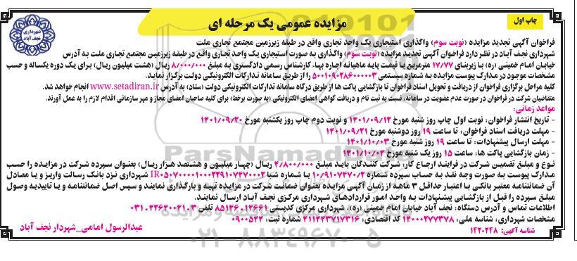 شهرداری نجف آباد در نظر دارد فراخوان آگهی تجدید مزایده(نوبت سوم) واگذاری به صورت استیجاری یک واحد تجاری واقع در طبقه زیرزمین مجتمع تجاری ملت به آدرس خیابان امام خمینی ( ره ) با زیربنای 77 . 17 مترمربع با قیمت پایه ماهیانه اجاره بهاء كارشناس رسمی دادگستری به مبلغ 000 . 000 . 8 ریال(هشت میلیون ریال) برای یك دوره یكساله و حسب مشخصات موجود در مدارك پیوست مزایده به شماره سیستمی 5001090286000003 را از طریق سامانه تداركات الكترونیكی دولت برگزار نماید.