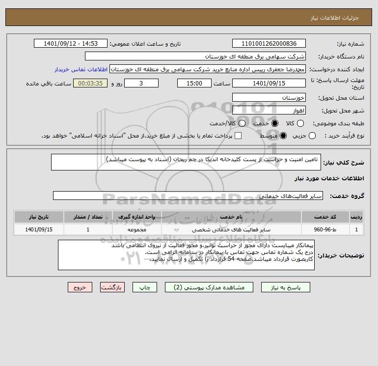 شرح کلی نیاز: تامین امنیت و حراست از پست کلیدخانه اندیکا در چم ریحان (اسناد به پیوست میباشد)