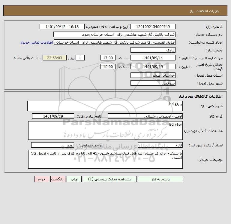 نام دستگاه خریدار:شرکت پالایش گاز شهید هاشمی نژاد استان خراسان رضوی