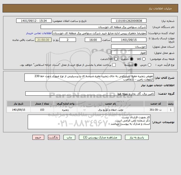 شرح کلی نیاز: تعویض زنجیره مقره سیلیکونی به جای زنجیره مقره شیشه ای و پرسیلینی از نوع عبوری جهت خط 230 کیلوولت رامین - شمالغرب