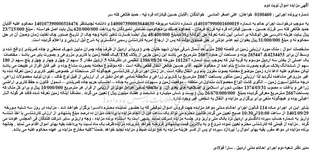 مزایده فروش یک قطعه زمین با کاربری مزروعی و بصورت بایر, مزایده فروش یک قطعه زمین با کاربری مزروعی و بصورت بایر