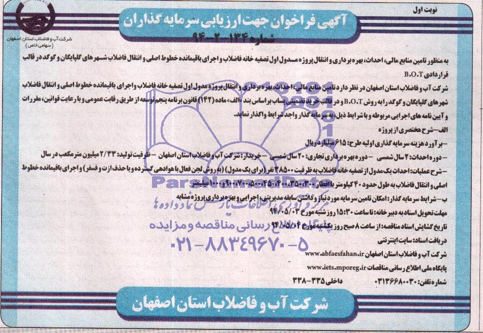شرکت آب و فاضلاب استان اصفهان در نظر دارد تامین منابع مالی، احداث، بهره برداری و انتقال پروژه مدول اول تصفیه خانه فاضلاب و اجرای باقیمانده خطوط اصلی و انتقال فاضلاب شهرهای گلپایگان و گوگد در قالب قراردادی B.O.T و در قالب خرید تضمینی پساب بر اساس بند الف ماده 142 قانون برنامه پنجم توسعه از طریق رقابت عمومی و با رعایت قوانین، مقررات و آیین نامه های اجرایی مربوطه با شرایط ذیل به سرمایه گذار واجد شرایط واگذار نماید.