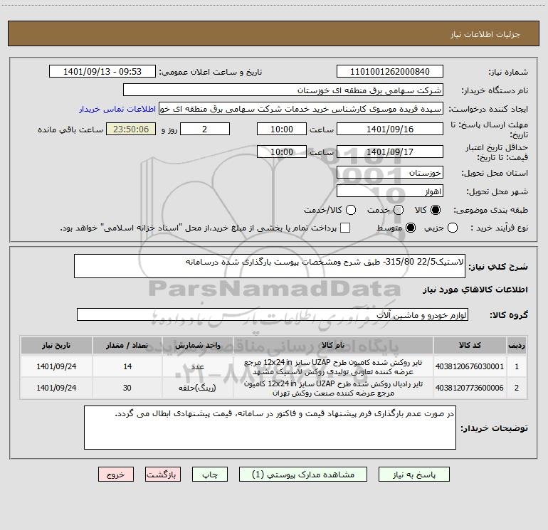 شرح کلی نیاز: لاستیک22/5 315/80- طبق شرح ومشخصات پیوست بارگذاری شده درسامانه
