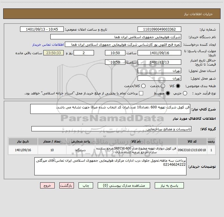 شرح کلی نیاز: فن کویل شرکت تهویه 600 ،تعداد10 عدد،ایران کد انتخاب شده صرفا جهت تشابه می باشد.