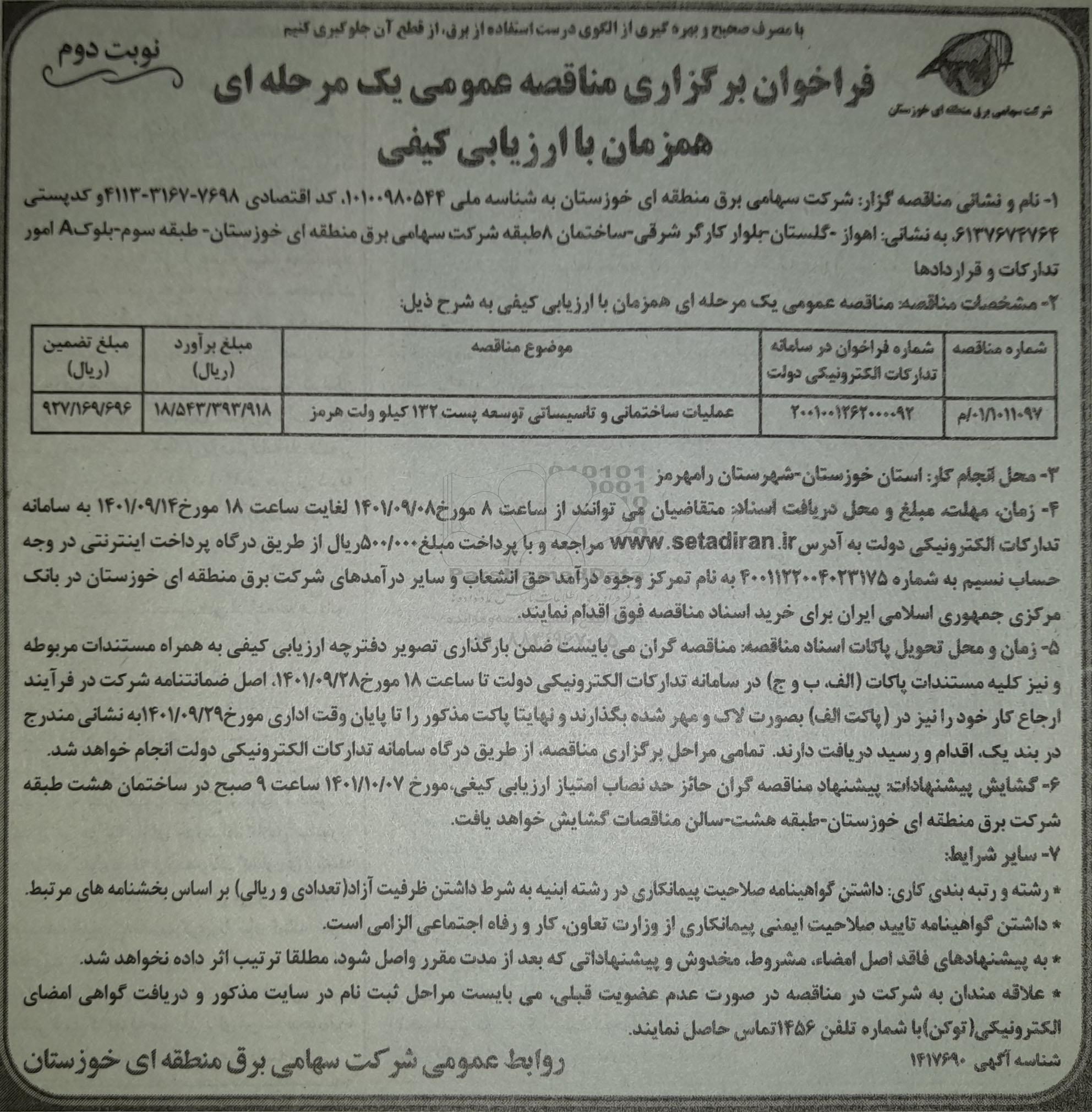 | 1011097/ 01/ م | 2001001262000092 | عملیات ساختمانی و تاسیساتی توسعه پست 132 کیلوولت هرمز | 18.543.393.918 | 927.169.696 |