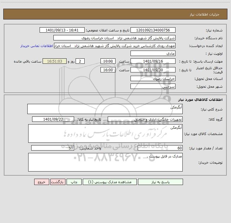 نام دستگاه خریدار:شرکت پالایش گاز شهید هاشمی نژاد استان خراسان رضوی