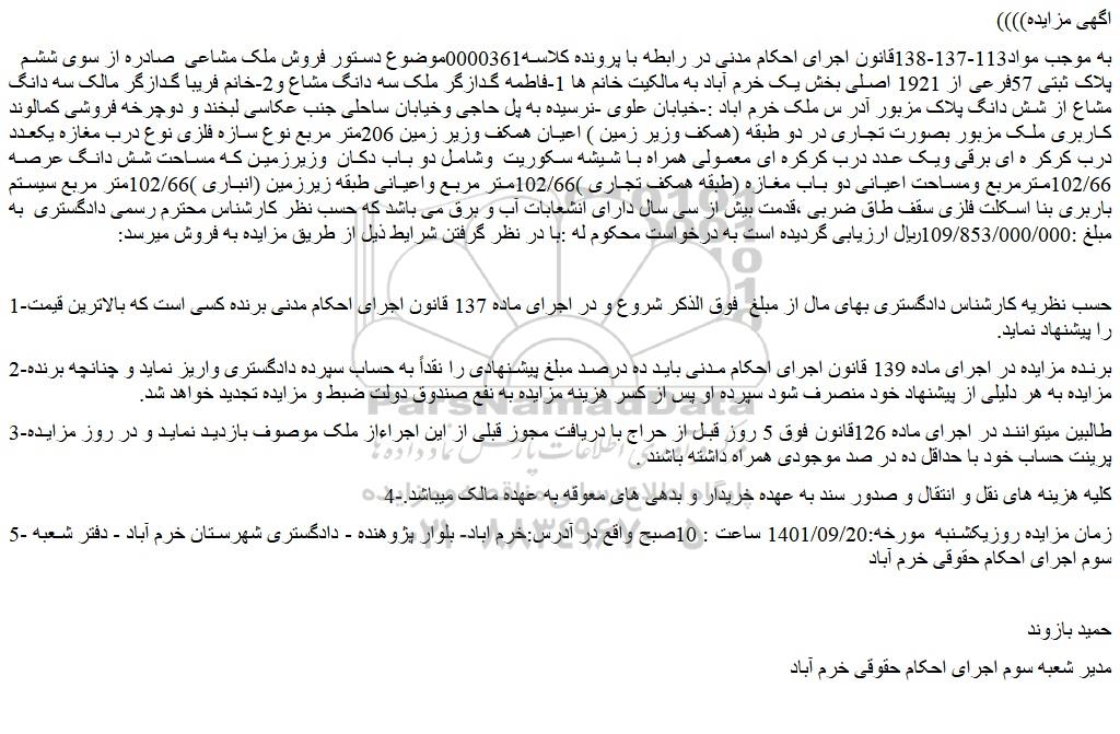 به موجب مواد113-137-138قانون اجرای احکام مدنی در رابطه با پرونده کلاسه0000361موضوع دستور فروش ملک مشاعی صادره از سوی ششم پلاک ثبتی 57فرعی از 1921 اصلی بخش یک خرم آباد به مالکیت خانم ها 1-فاطمه گدازگر ملک سه دانگ مشاع و2-خانم فریبا گدازگر مالک سه دانگ مشاع از شش دانگ پلاک مزبور آدر س ملک خرم اباد :-خیابان علوی -نرسیده به پل حاجی وخیابان ساحلی جنب عکاسی لبخند و دوچرخه فروشی کمالوند کاربری ملک مزبور بصورت تجاری در دو طبقه (همکف وزیر زمین ) اعیان همکف وزیر زمین 206متر مربع نوع سازه فلزی نوع درب مغازه یکعدد درب کرکر ه ای برقی ویک عدد درب کرکره ای معمولی همراه با شیشه سکوریت وشامل دو باب دکان وزیرزمین که مساحت شش دانگ عرصه 102/66مترمربع ومساحت اعیانی دو باب مغازه (طبقه همکف تجاری )102/66متر مربع واعیانی طبقه زیرزمین (انباری )102/66متر مربع سیستم باربری بنا اسکلت فلزی سقف طاق ضربی ،قدمت بیش از سی سال دارای انشعابات آب و برق می باشد که حسب نظر کارشناس محترم رسمی دادگستری به مبلغ :109/853/000/000ریال ارزیابی گردیده است به درخواست محکوم له :با در نظر گرفتن شرایط ذیل از طریق مزایده به فروش میرسد: