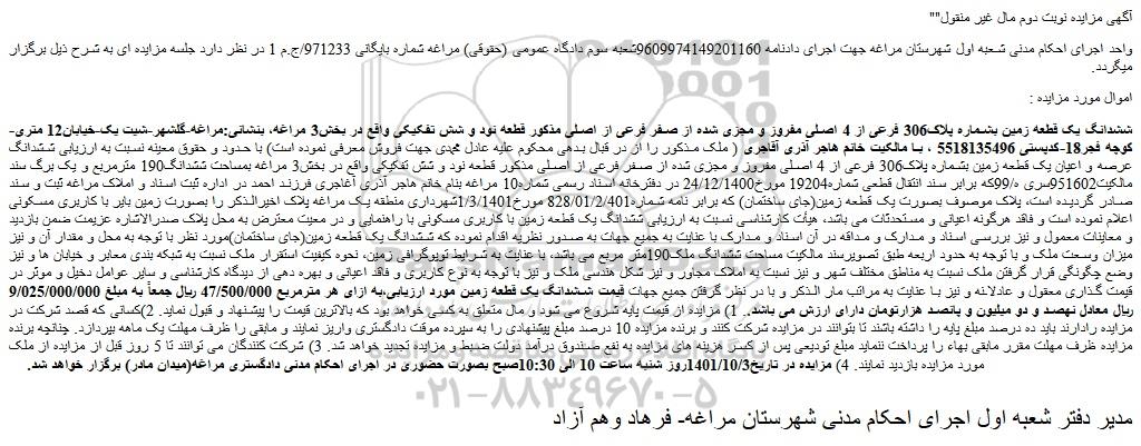 مزایده فروش ششدانگ یک قطعه زمین بشماره پلاک306 فرعی از 4 اصلی مفروز و مجزی شده از صفر فرعی از اصلی ؟
