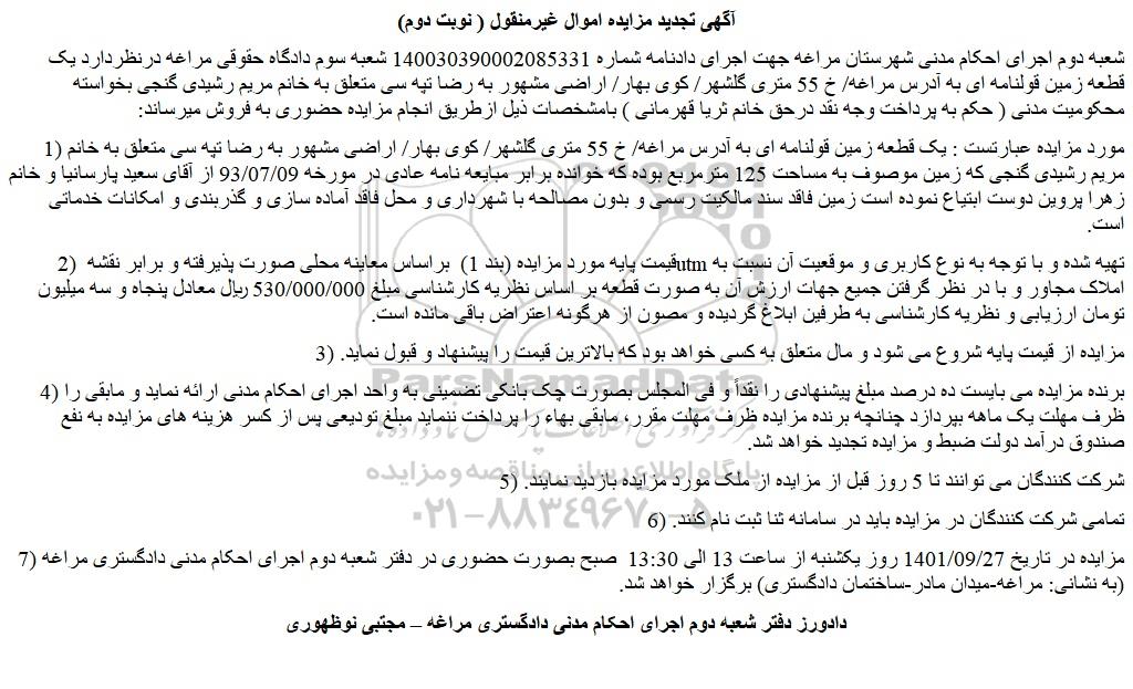 شعبه دوم اجرای احکام مدنی شهرستان مراغه جهت اجرای دادنامه شماره 140030390002085331 شعبه سوم دادگاه حقوقی مراغه درنظردارد یک قطعه زمین قولنامه ای به آدرس مراغه/ خ 55 متری گلشهر/ کوی بهار/ اراضی مشهور به رضا تپه سی متعلق به خانم مریم رشیدی گنجی بخواسته محکومیت مدنی ( حکم به پرداخت وجه نقد درحق خانم ثریا قهرمانی ) بامشخصات ذیل ازطریق انجام مزایده حضوری به فروش میرساند: