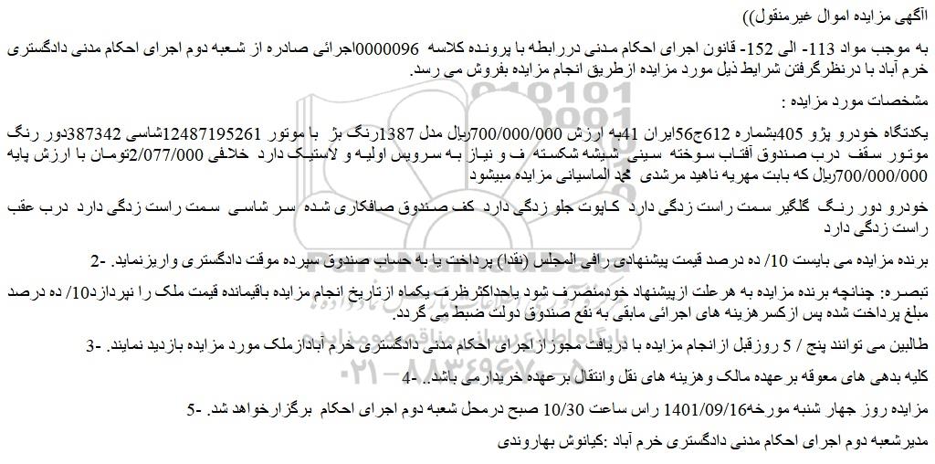 به موجب مواد 113- الی 152- قانون اجرای احکام مدنی دررابطه با پرونده کلاسه  0000096اجرائی صادره از شعبه دوم اجرای احکام مدنی دادگستری خرم آباد با درنظرگرفتن شرایط ذیل مورد مزایده ازطریق انجام مزایده بفروش می رسد.